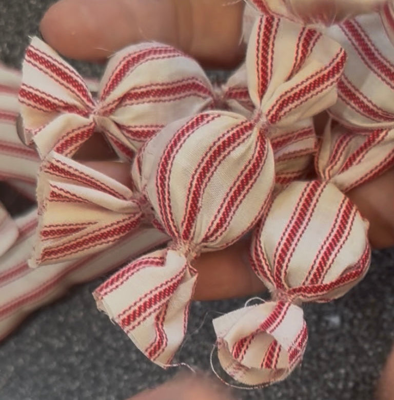 Recycled metal caps wrapped with ticking fabric to create fun holiday candies! Perfect for bowl fillers or gift wrapping accents.