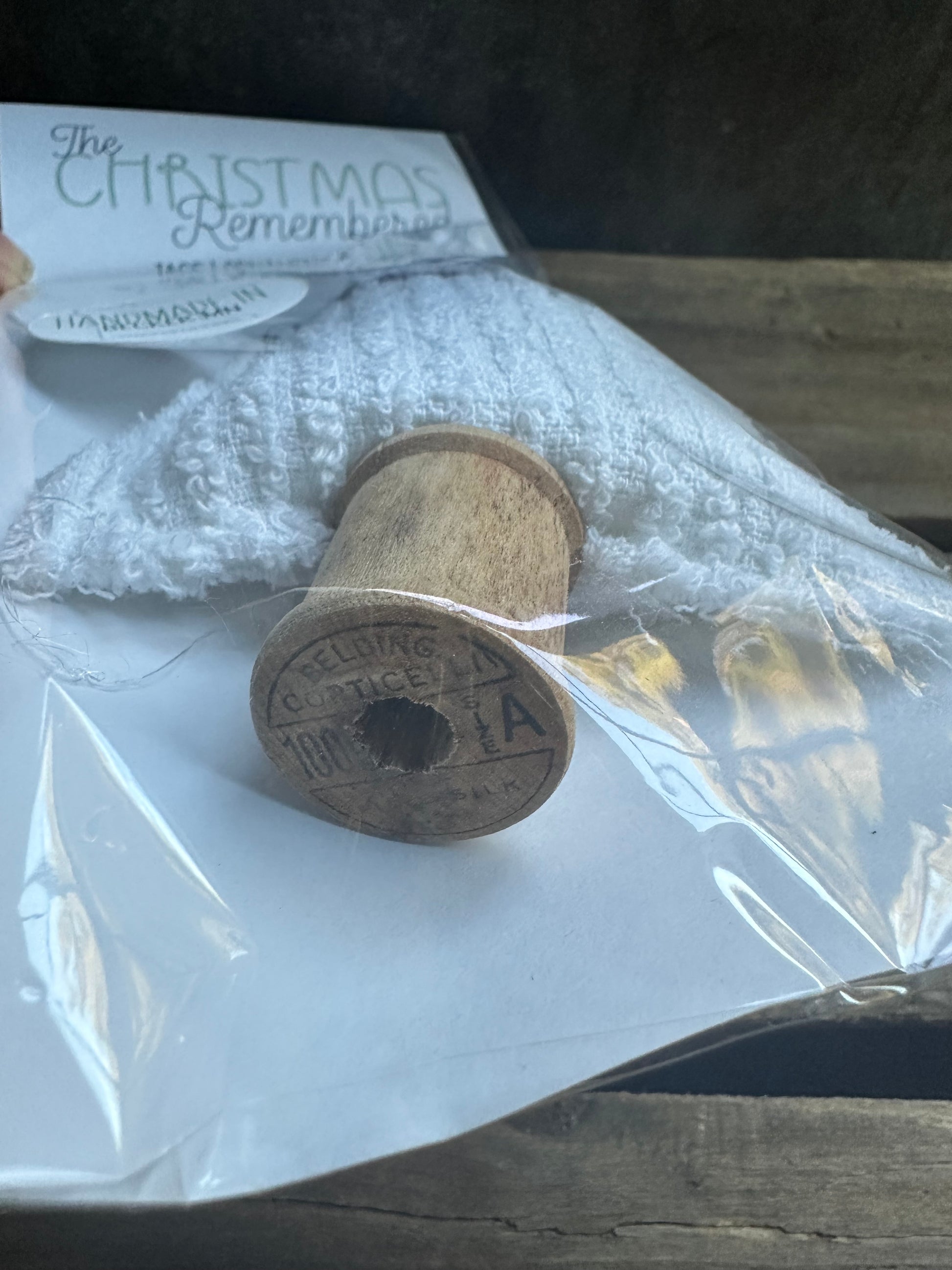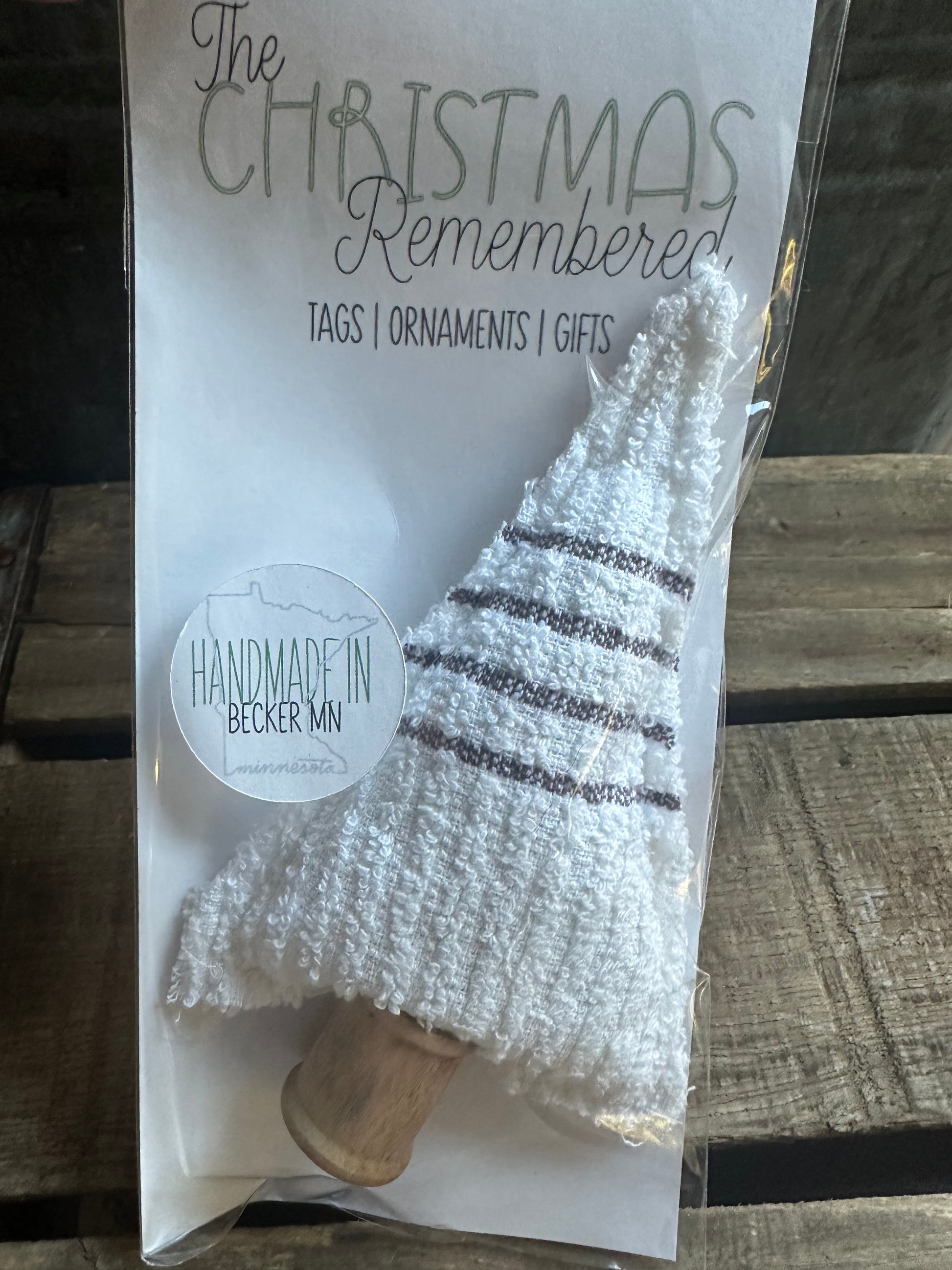 Recycled terry cloth towels fabric into cute mini slouch tree with vintage wooded spool base.