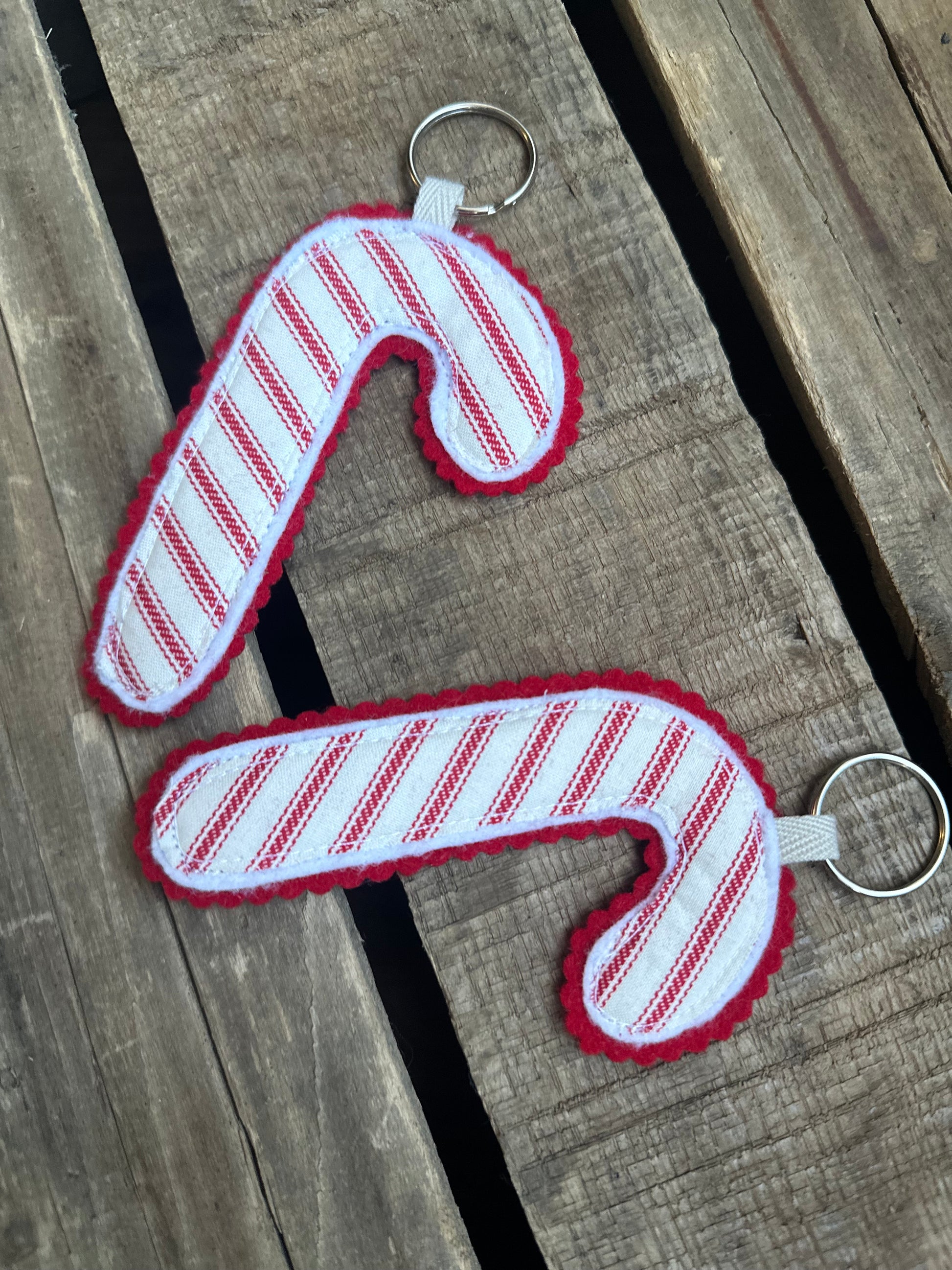Soft candy cane key ring from cotton and scraps. Perfect to make Holliday errands more fun— for yourself or as a gift!
