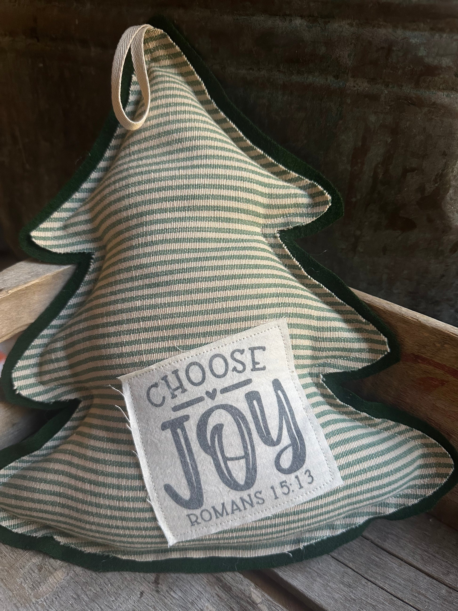 Striped Tree hanging pillow— perfect for your peg shelf or tuck twill strap and use on shelf. Recycled ticking canvas fabric. Raw edge. Filled with loose poly fill. Backed with recycled deep green felted wool. Overlay patch says: Choose Joy Romans 15:13