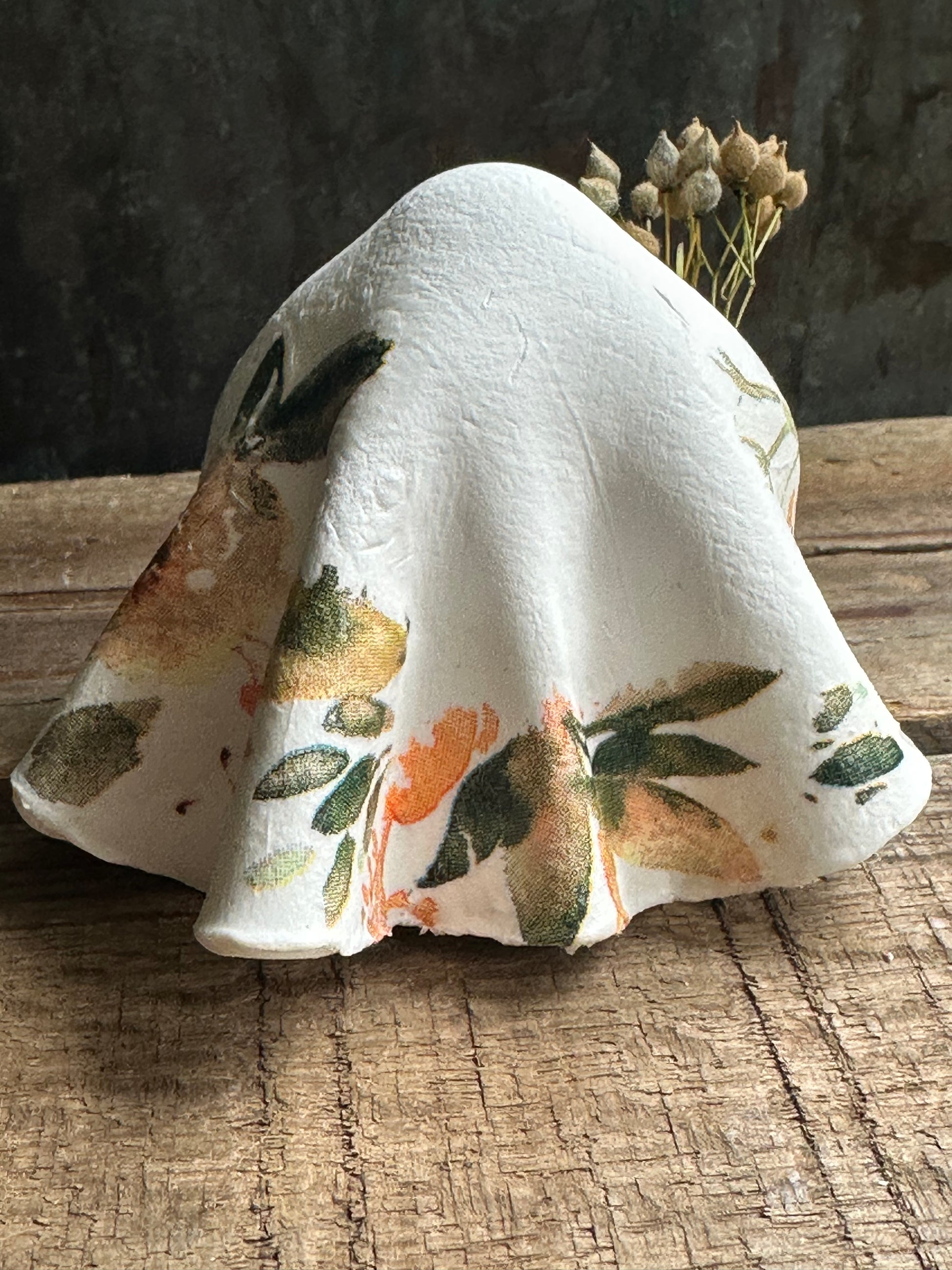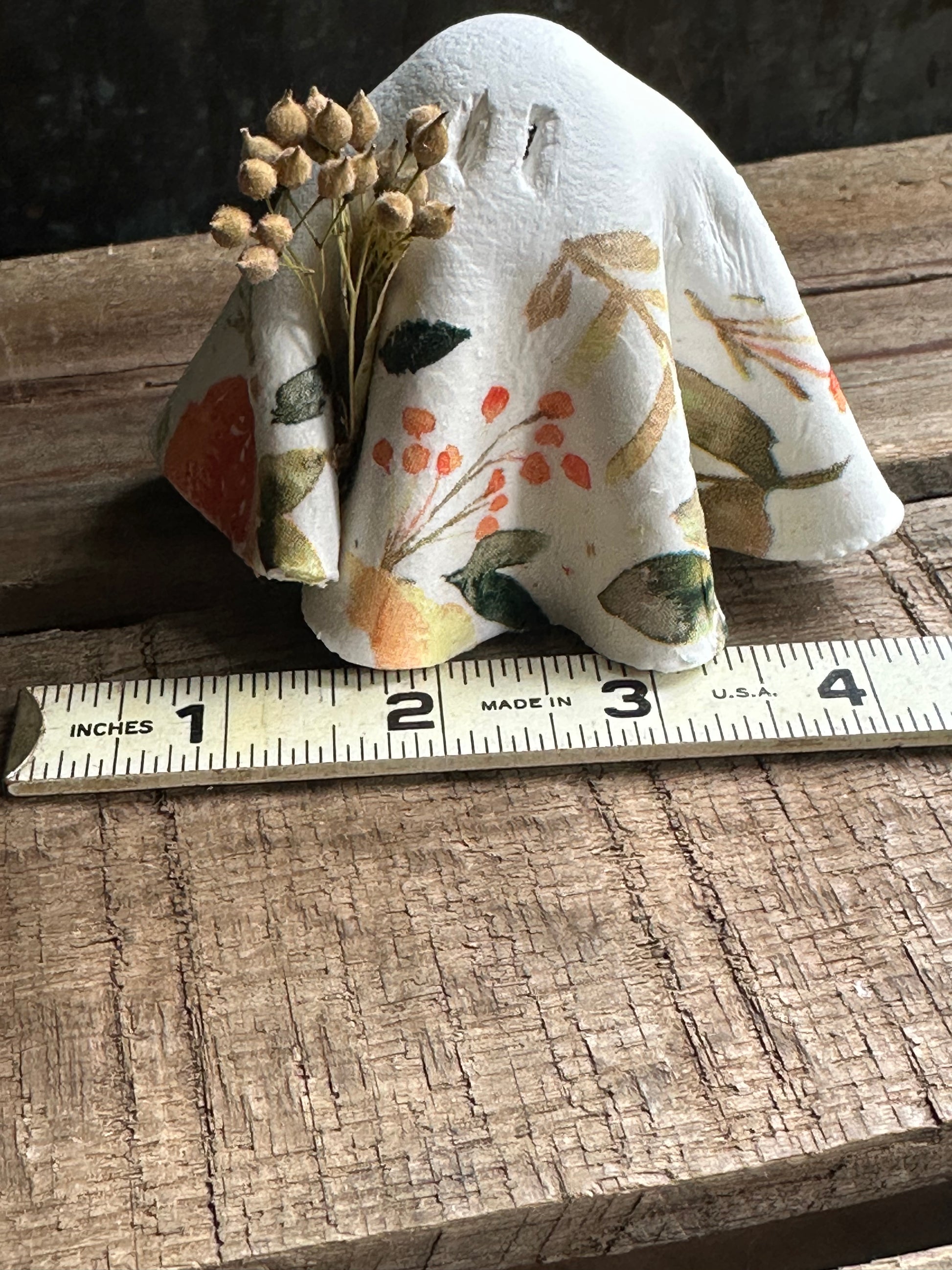 Unique one of a kind shelf sitter —perfect for fall! Friendly + cute clay ghost hand formed + holding flowers. Hand decoupaged and sealed.