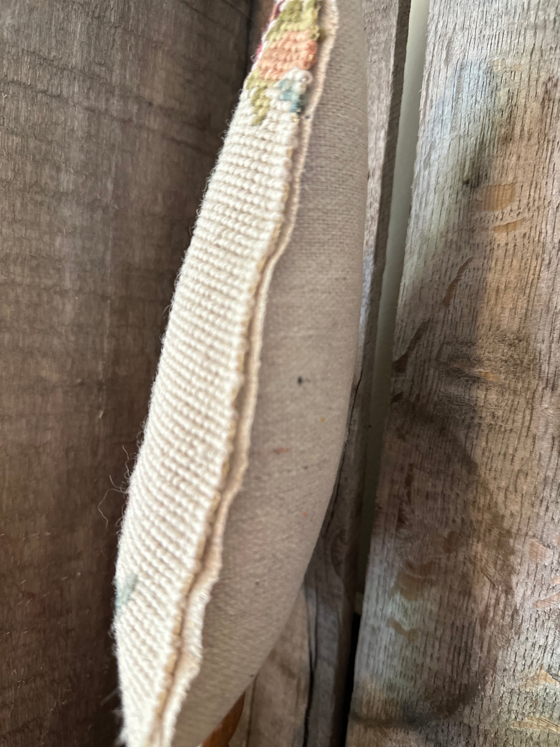 Salvaged Chair Tapestry slouch tree with old wood spindle base. Raw edge. Canvas back.