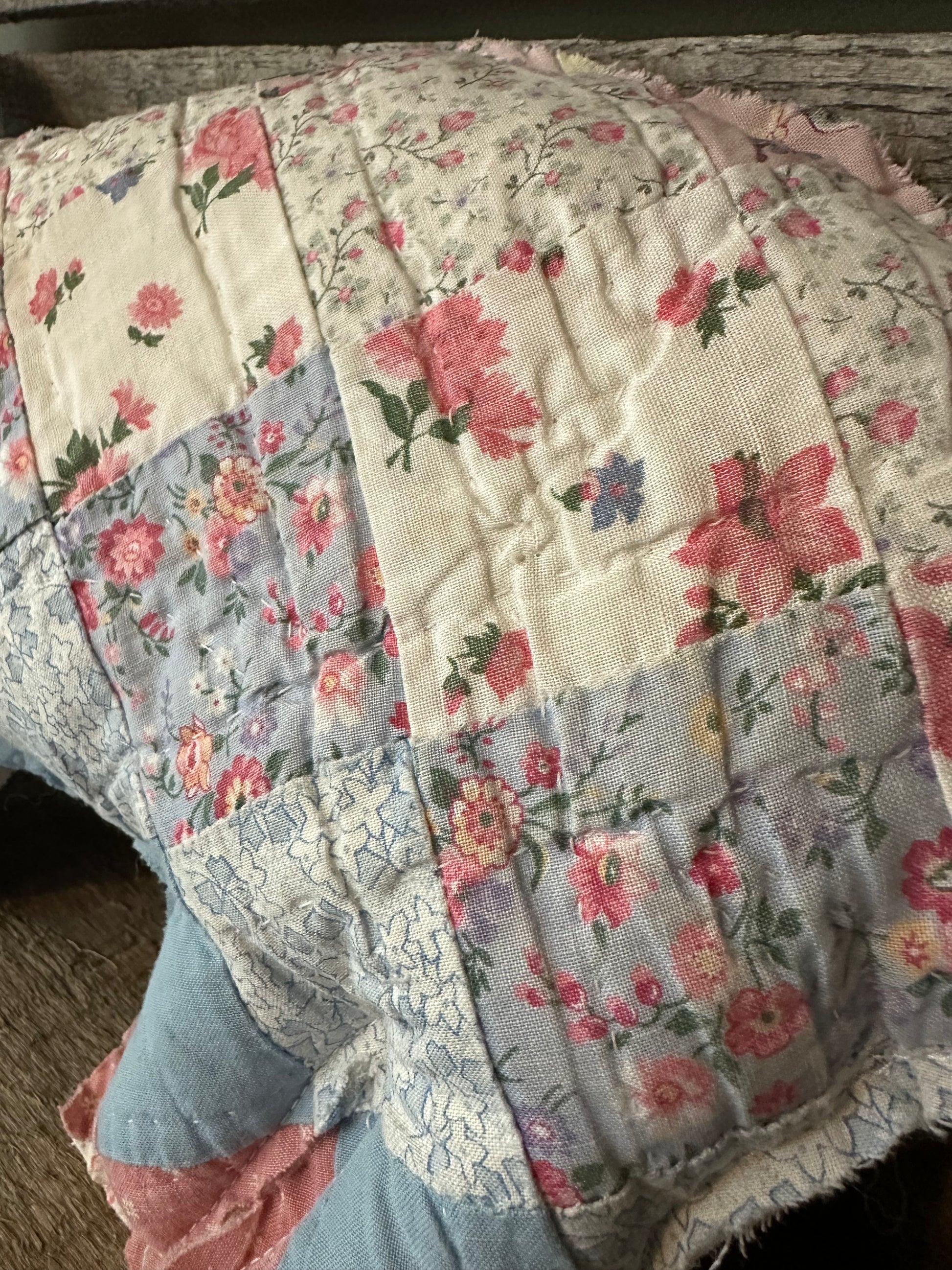 Handmade pig pillow from cutter quilt. Made from OLD repurposed textiles so fabric may show signs of wear, age, or stains. Filled with loose poly-fill. This Scrappy Pig has a removable chiffon ribbon and vintage tablecloth back.