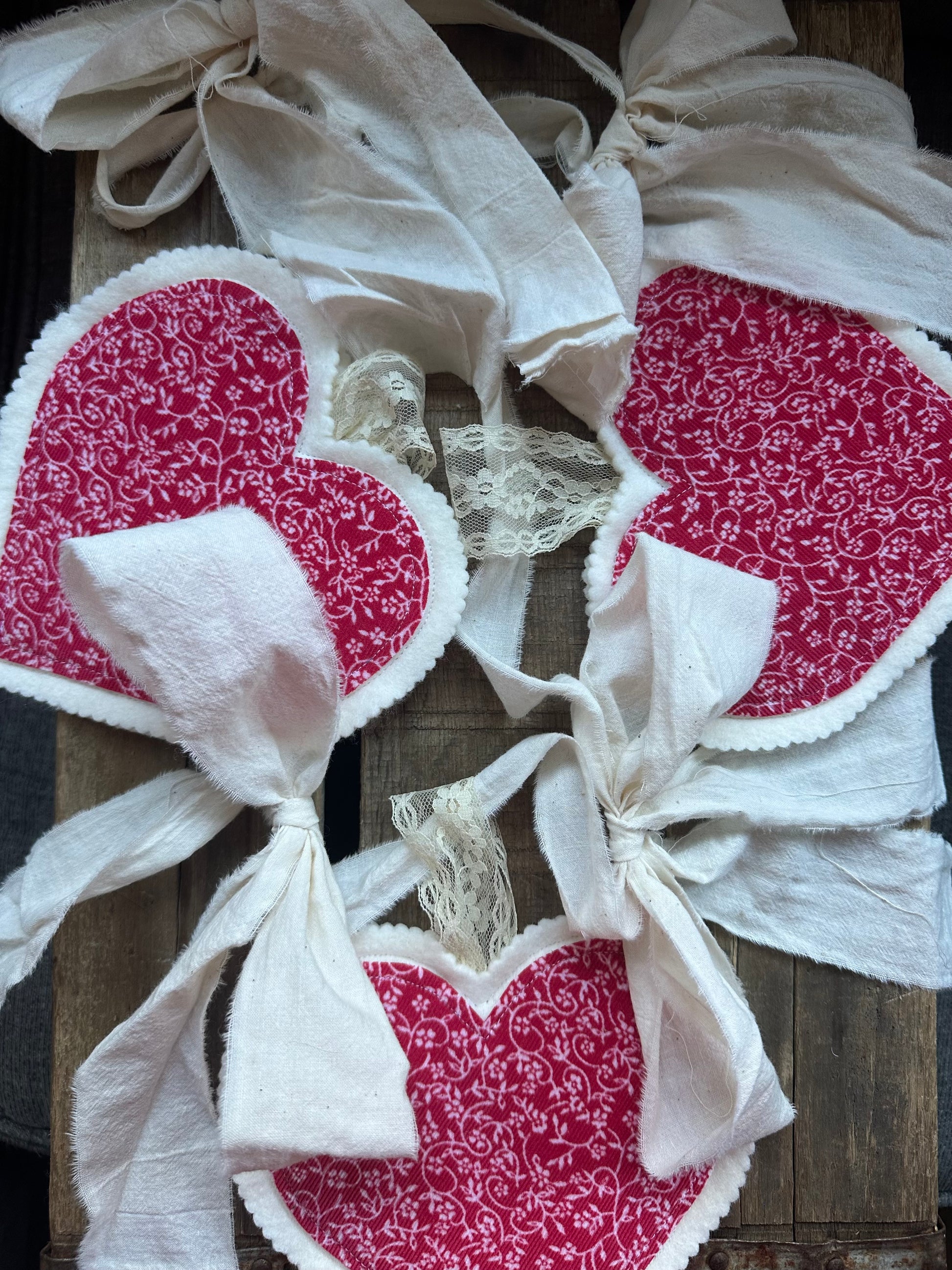 Hearts from salvaged narrow corduroy jumper + double-backed with vintage 1960s wool blanket pieces for excellent drape. Cotton bows and salvaged very old lace. Raw edges. Worn cotton garland hanger — easy to tie or shorten to your desired length. All pieces moveable for your desired look.