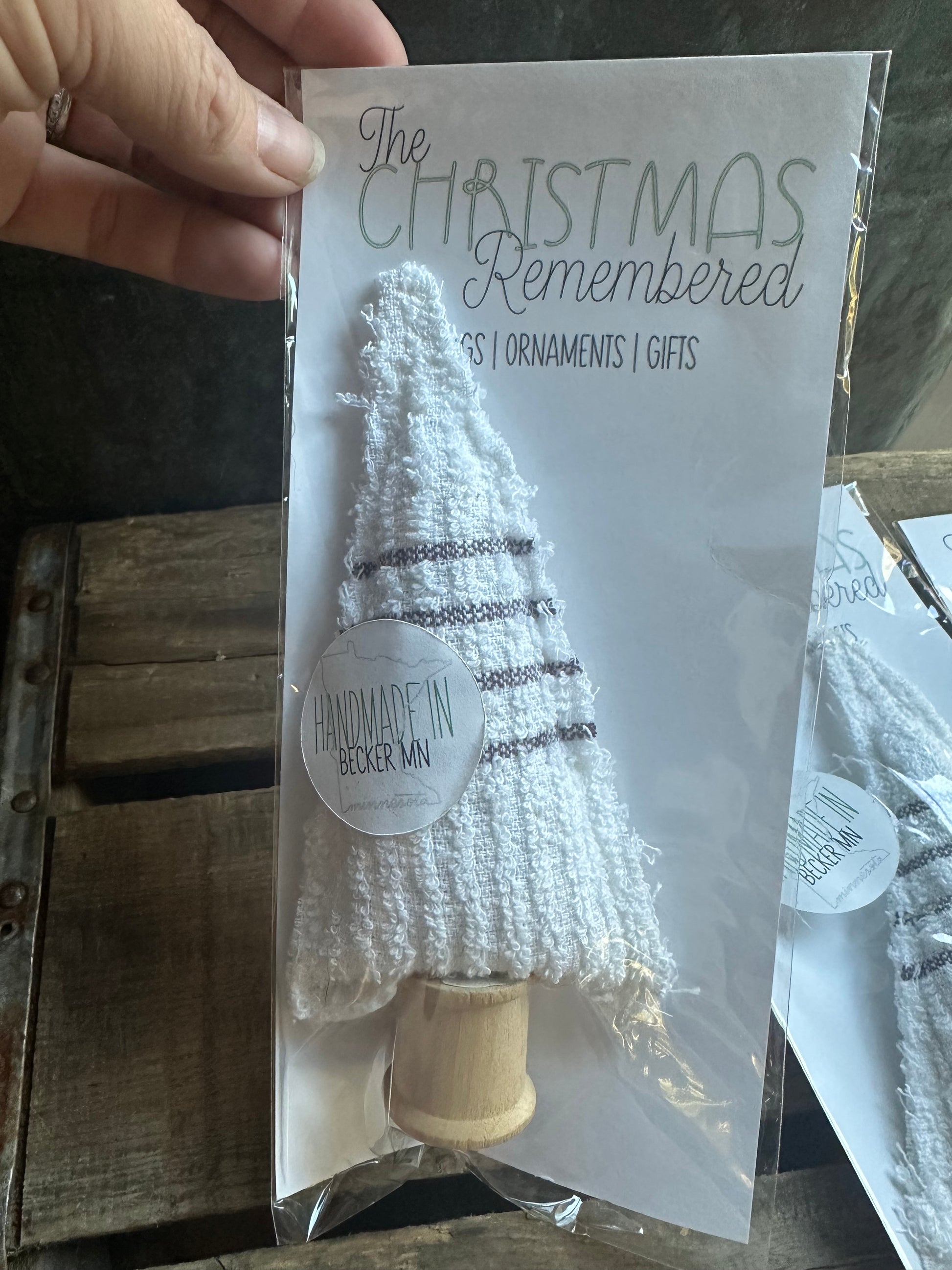 Recycled terry cloth towels fabric into cute mini slouch tree with vintage wood spool base.