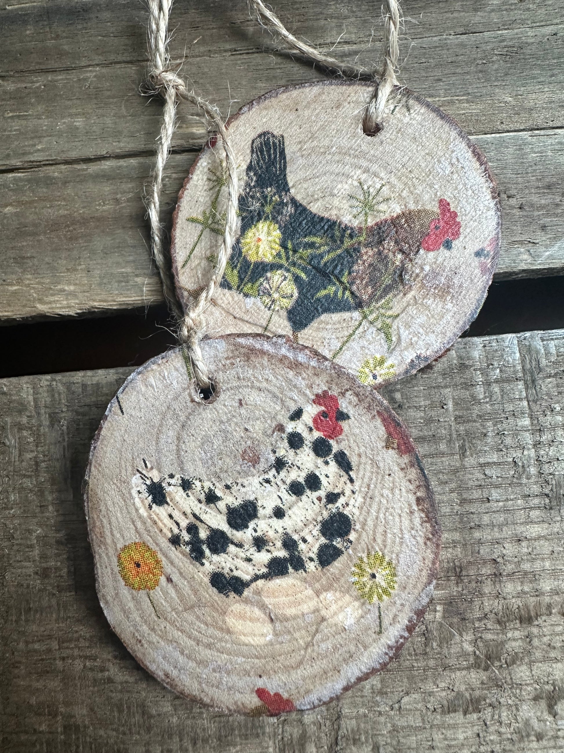 SET of 2 includes: (1) white chicken with eggs and (1) black chicken with flowers created from wood slices and repurposed napkin hand decoupaged. Jute twine hanger.