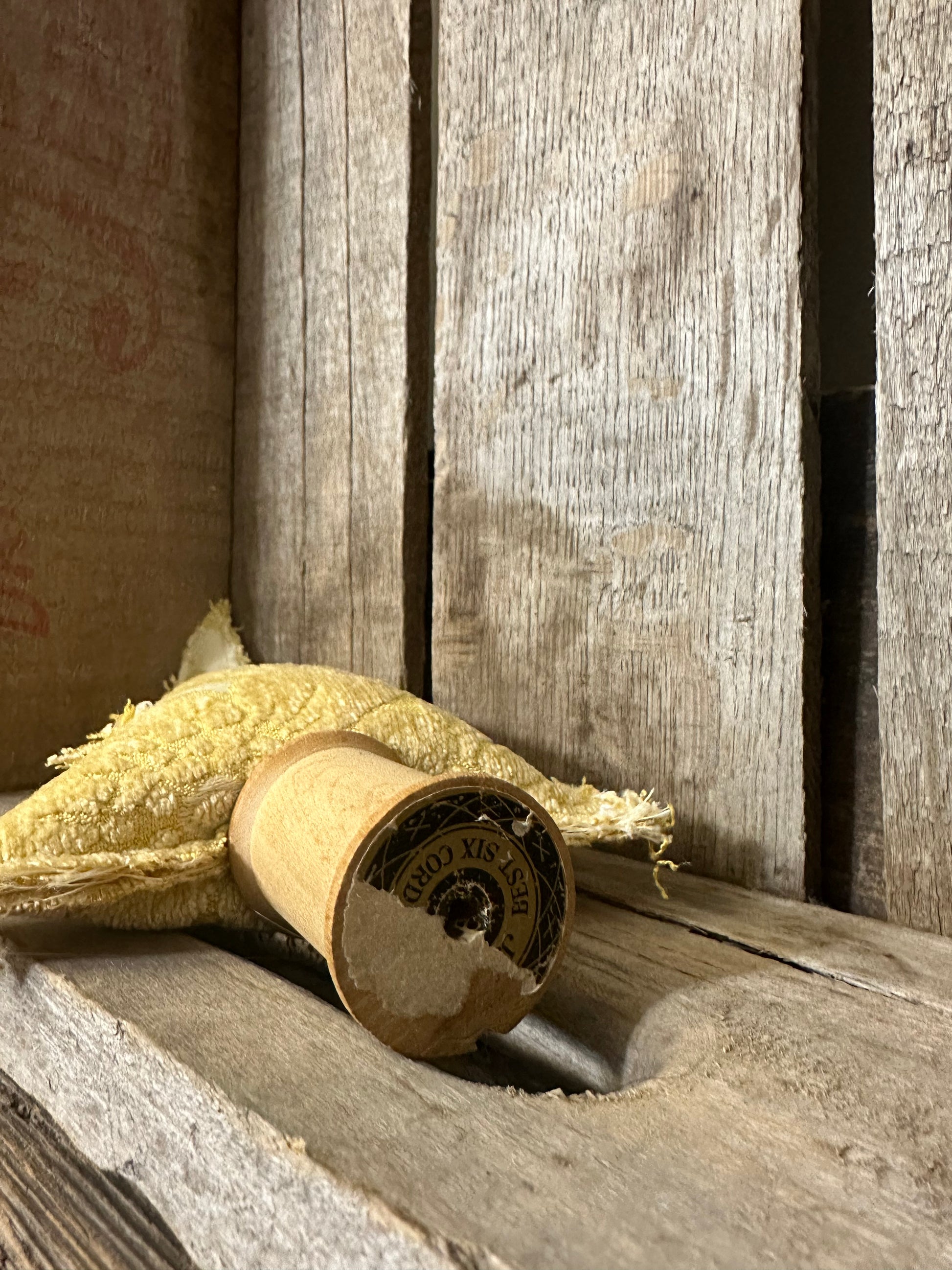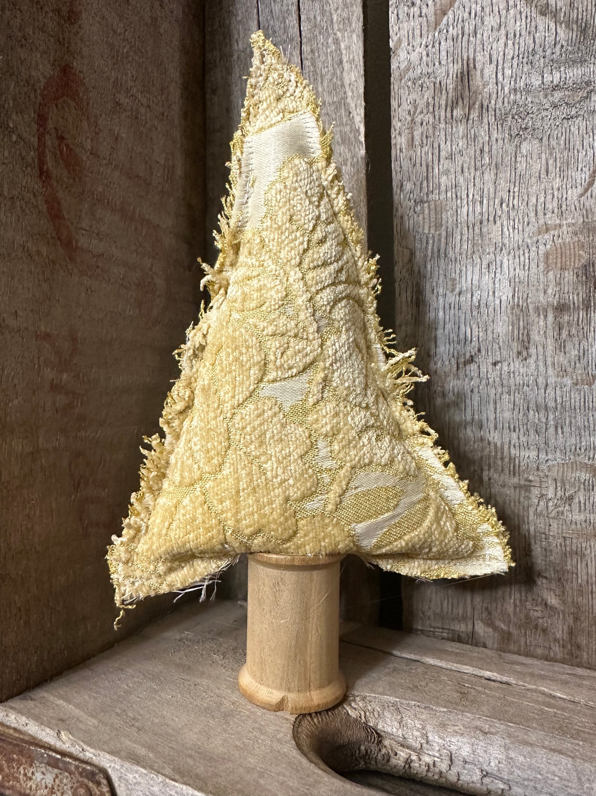 Recycled upholstery and wood thread spool accent tree.