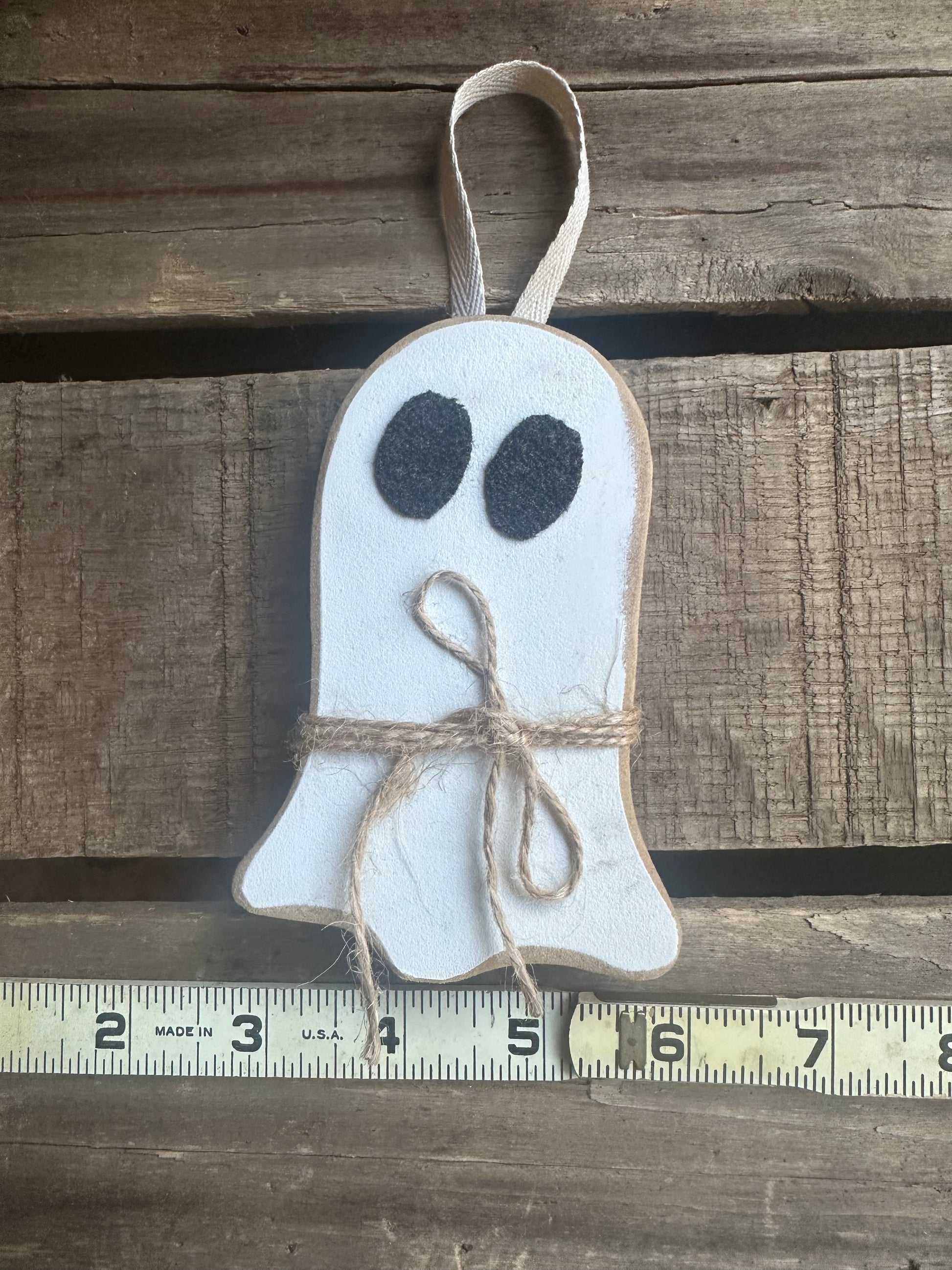 Salvaged trim transformed into sweet ghost hanger. Perfect for a kitchen window leaner, bookshelf, vendor booth, or peg rail for seasonal fun. Can also tuck cotton hanger and use as bowl filler.